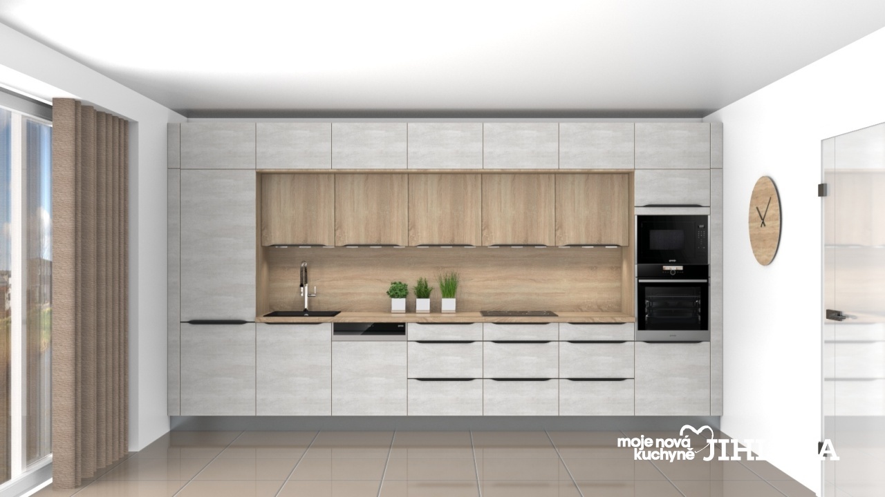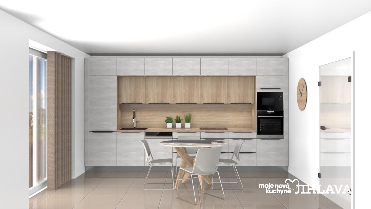 Kuchyně je v matném provedení bílého betonu Celine v kombinaci s Corou teplým dubem Sonoma, který je použitý na pracovní desce, horních skříních a bocích vestavné chladničky a trouby.