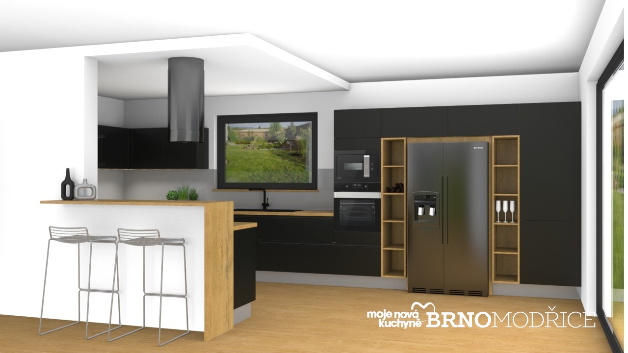 Spotřebiče gorenje z designové řady ORA-ïto, trouba, mikrovlnná trouba, varná deska, myčka, obestavěná americká chladnička s ledovačem v černém provedení. Odsavač par zákazníci měli vlastní.