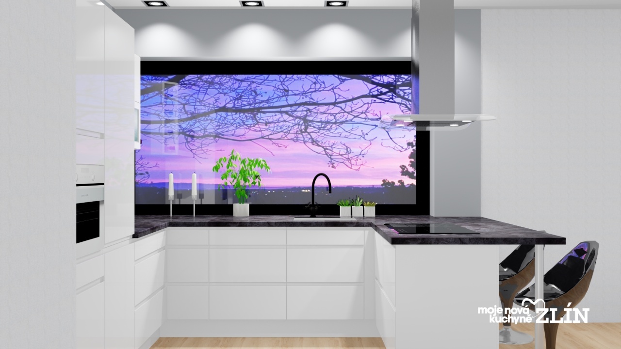 Moderní bílá Tessa z prémiové řady ve vysokém lesku s tmavou kamennou deskou.