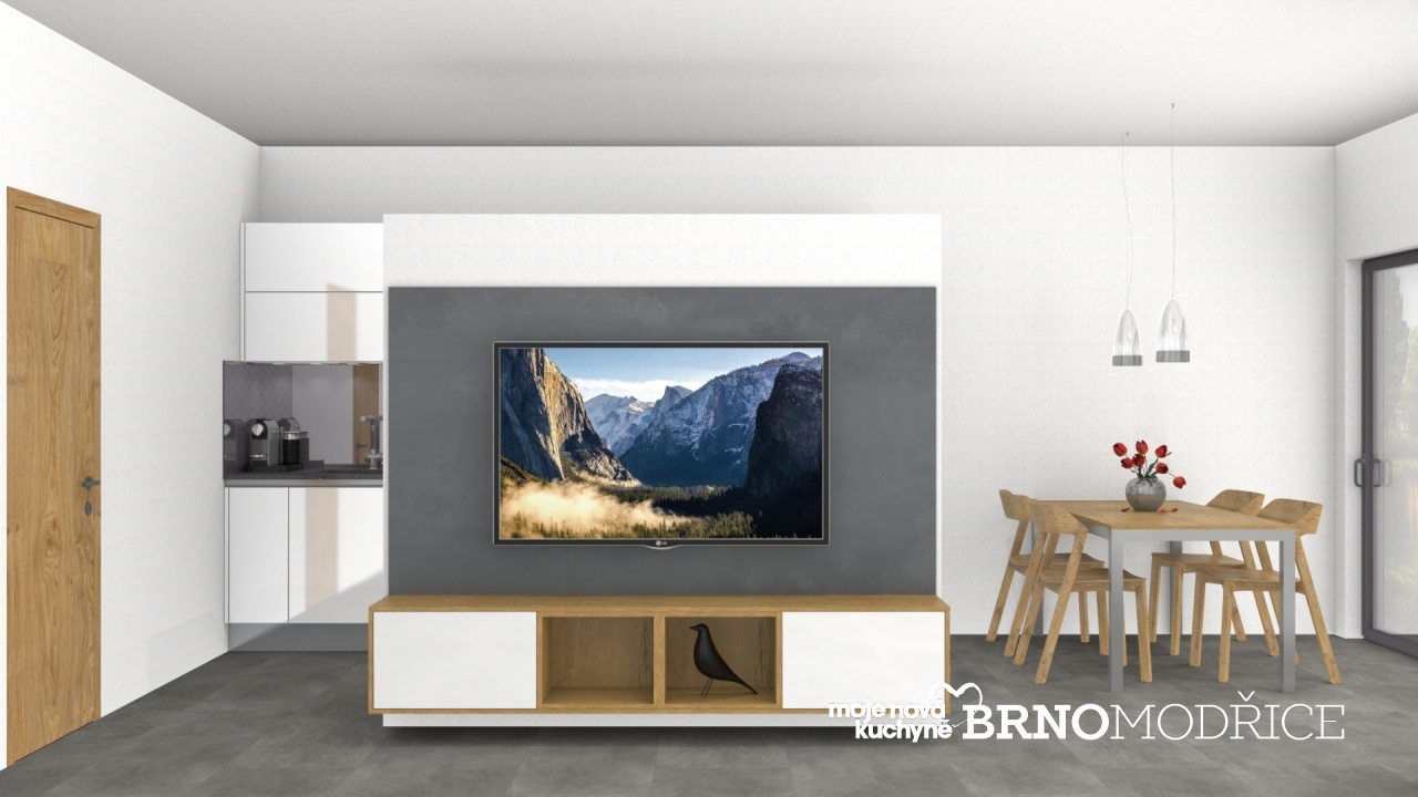 Za televizí je použita deska v imitaci antracitového betonu pro výraznější propojení s kuchyňskou linkou. Tato deska je navíc řešena nižší než příčka pro optické snížení.